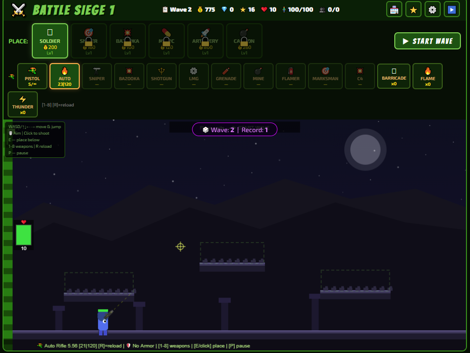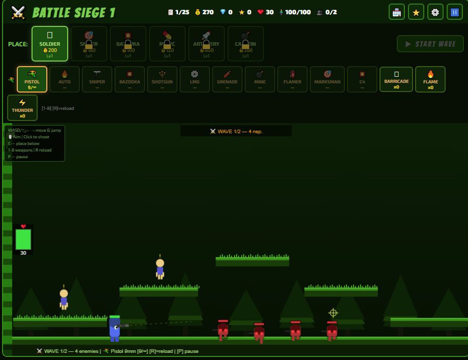 Battle Siege 1 is a 2D side-scrolling tower defense action game where you play as a soldier defending your base against waves of enemies.