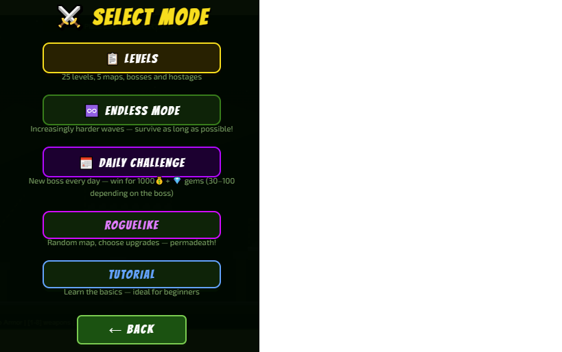 - Roguelike — Random map, choose upgrades between waves, permadeath